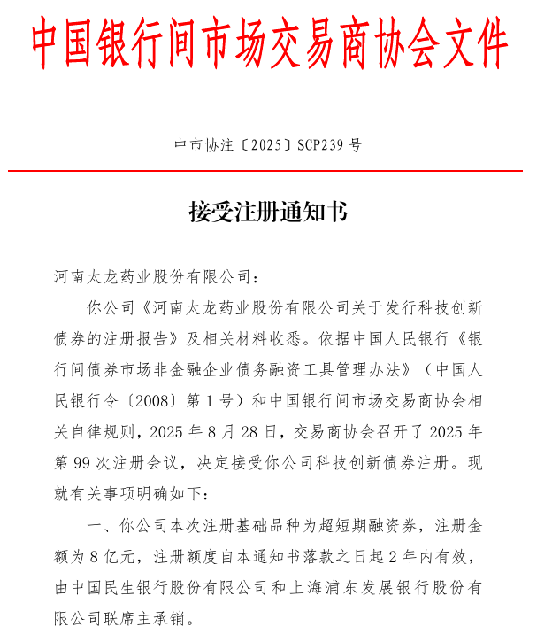 【大河财立方消息】中国银行间市场交易商协会日前批复,接受河南太龙药业(600222)股份有限公司超短期融资券注册,注册金额为8亿元,注册额度自2025年9月2日起2年内有效,由民生银行和浦发银行联席主承销。