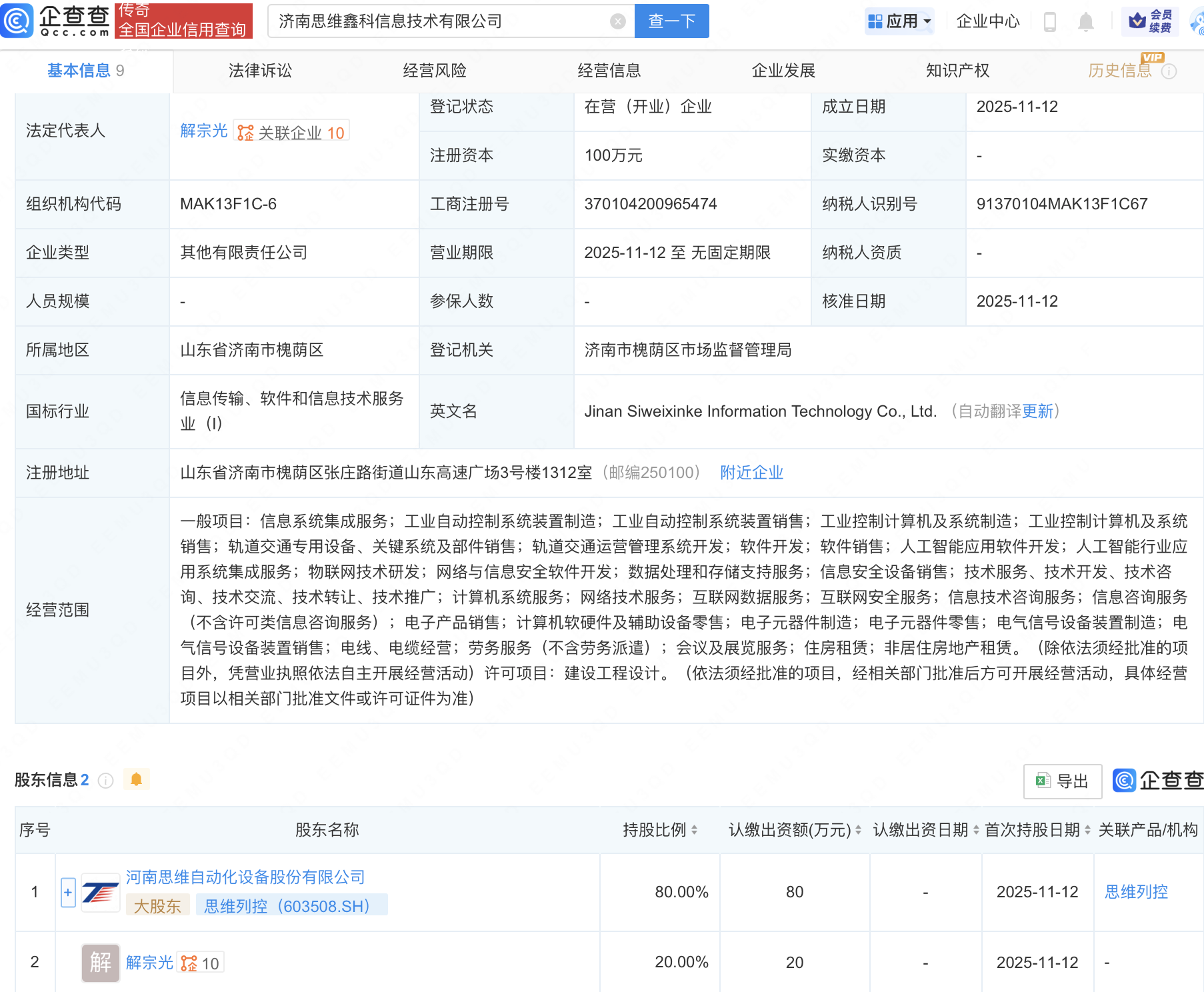 近日,济南思维鑫科信息技术有限公司成立,经营范围包含:人工智能应用软件开发;人工智能行业应用系统集成服务;物联网技术研发;网络与信息安全软件开发等。企查查股权穿透显示,该公司由思维列控(603508)等共同持股。
