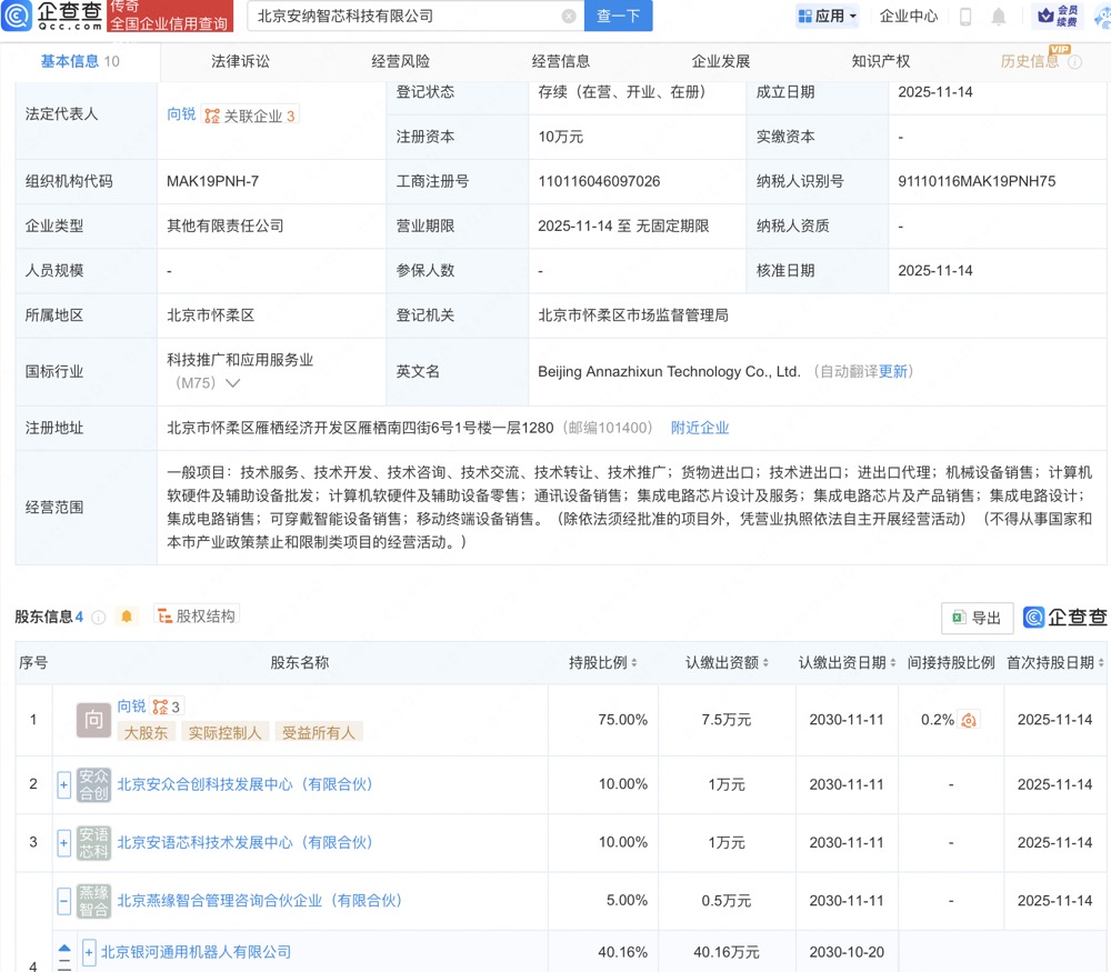 近日,北京安纳智芯科技有限公司成立,经营范围包含:集成电路芯片设计及服务;集成电路芯片及产品销售;集成电路设计;集成电路销售等。企查查股权穿透显示,该公司由北京燕缘智合管理咨询合伙企业(有限合伙)等共同持股,后者大股东为北京银河通用机器人有限公司,持股40.16%。